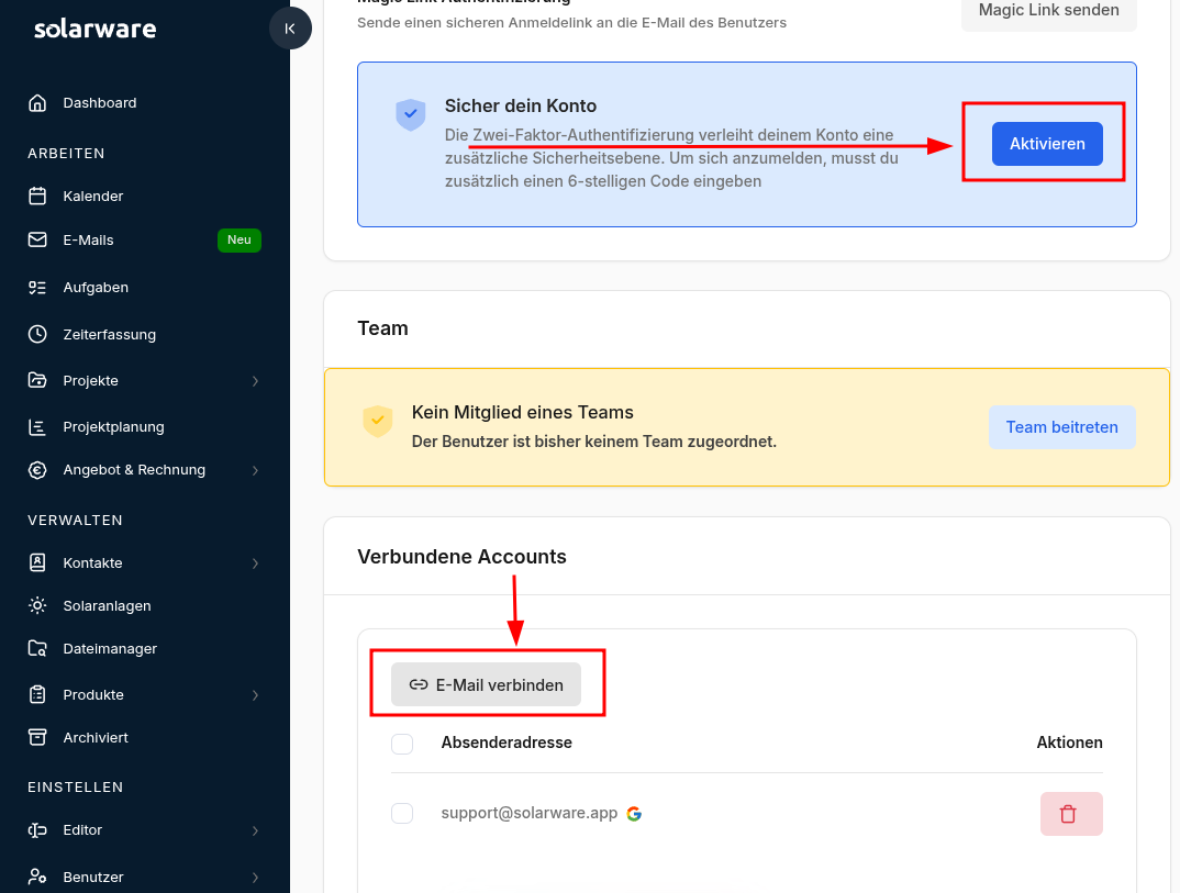 Zudem zeig ich Dir, wo Du die 2-Faktor-Authentifizierung aktivierst und wie Du Solarware mit deinem bestehenden Email/Kalender verbindest (z.B. GMail, Microsoft Outlook, IMAP, CalDav, etc.)