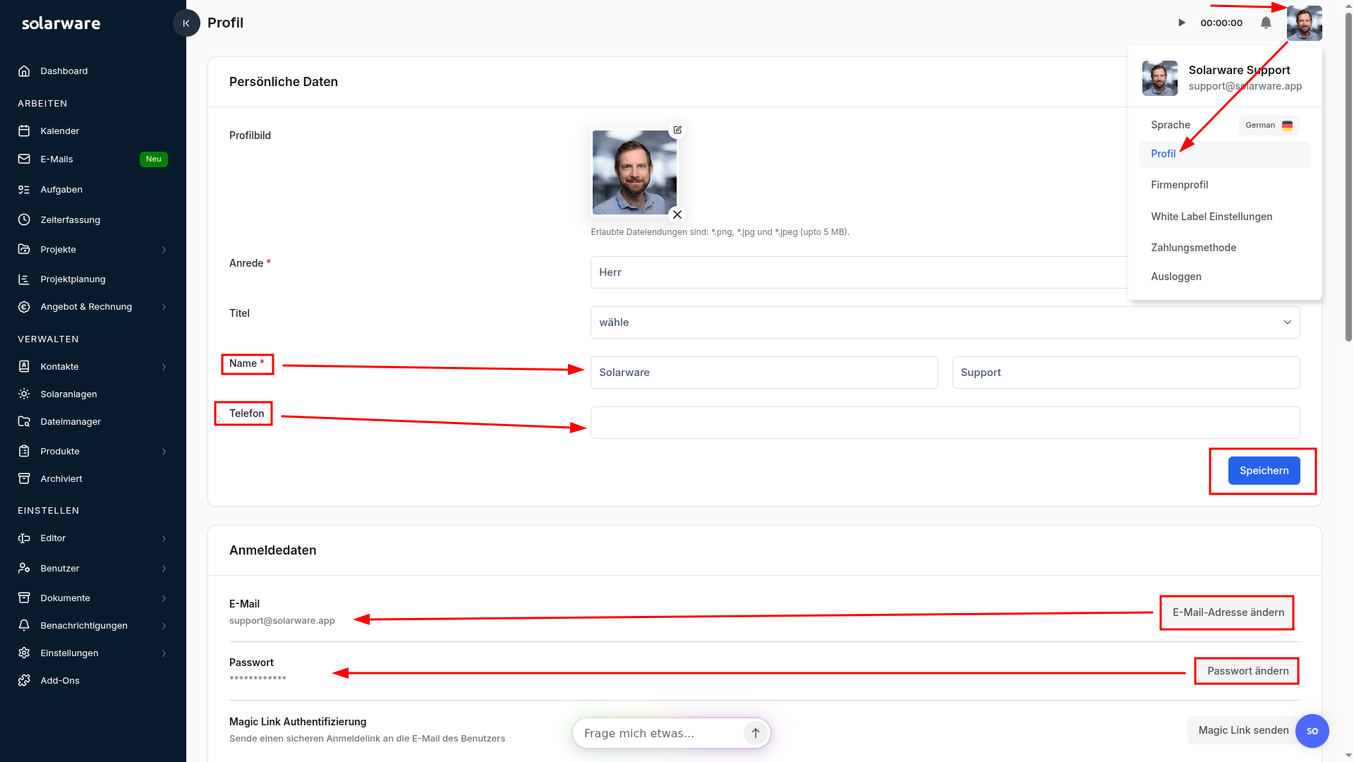 Hier siehst Du, wie Du deinen Name, Avatar und deine Email-Adresse änderst.