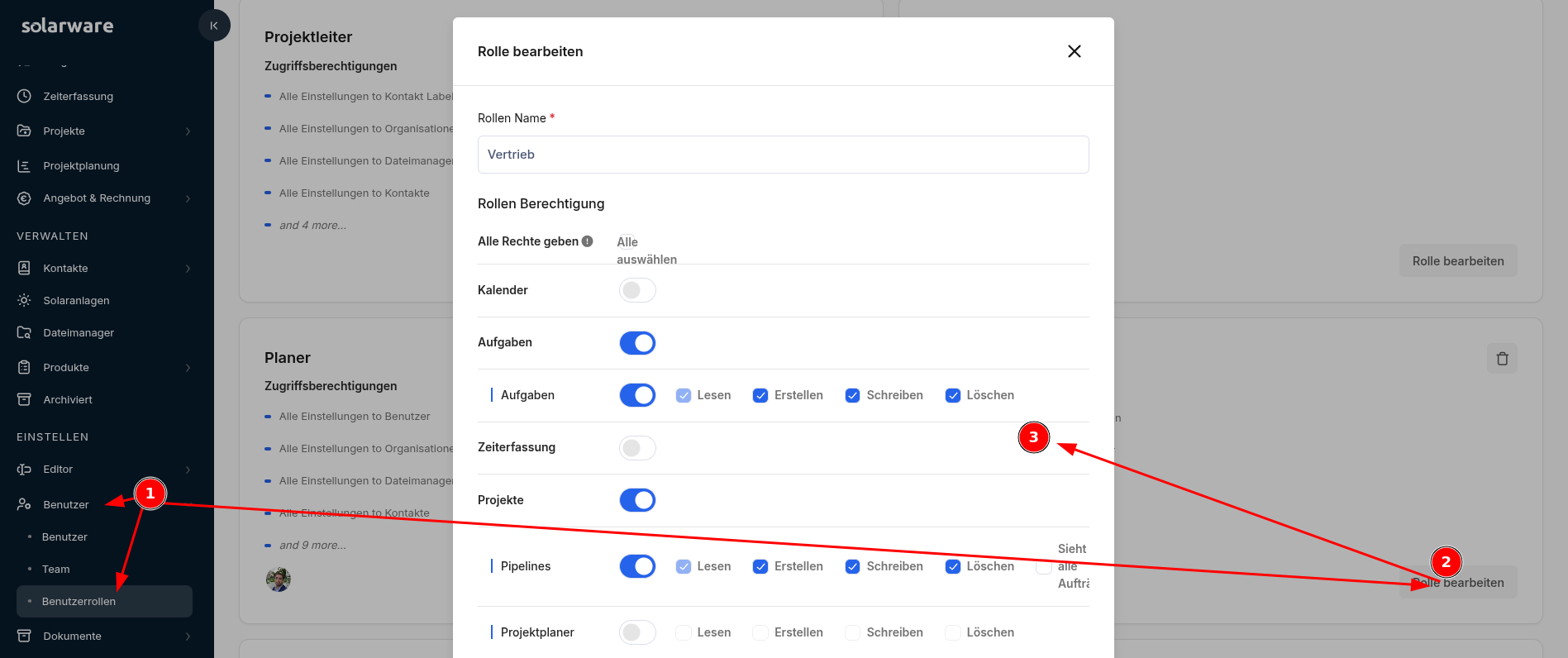 Und hier (1) legst Du fest, welche Rolle (2) welche Rechte (3) hat.