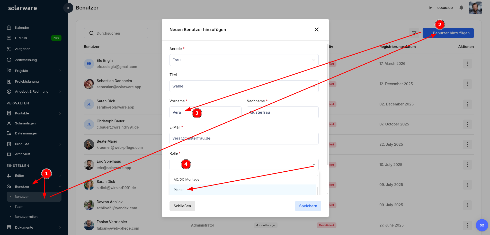In (4) bestimmst Du, welche Rolle/Rechte dein*e Mitarbeiter*in hat.