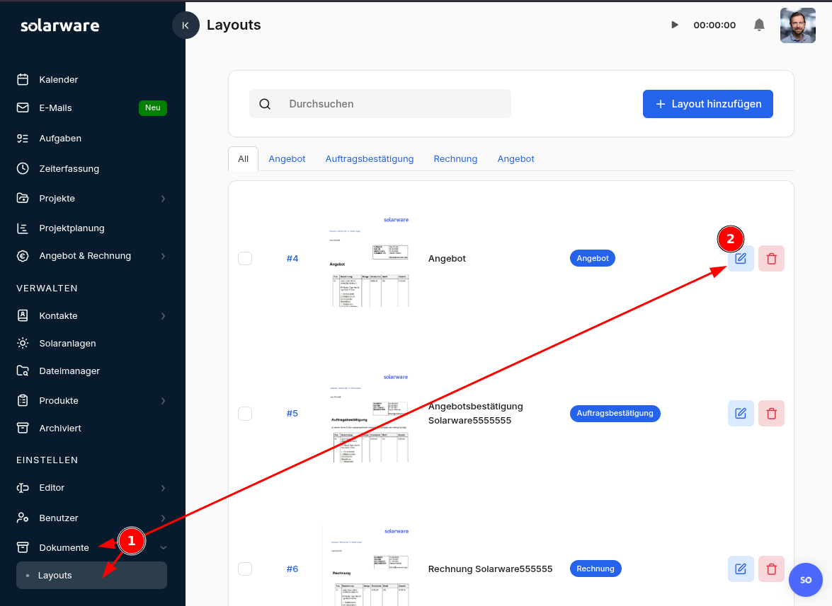 Wähle hier (1) ein Layout, was Du bearbeiten (2) willst: