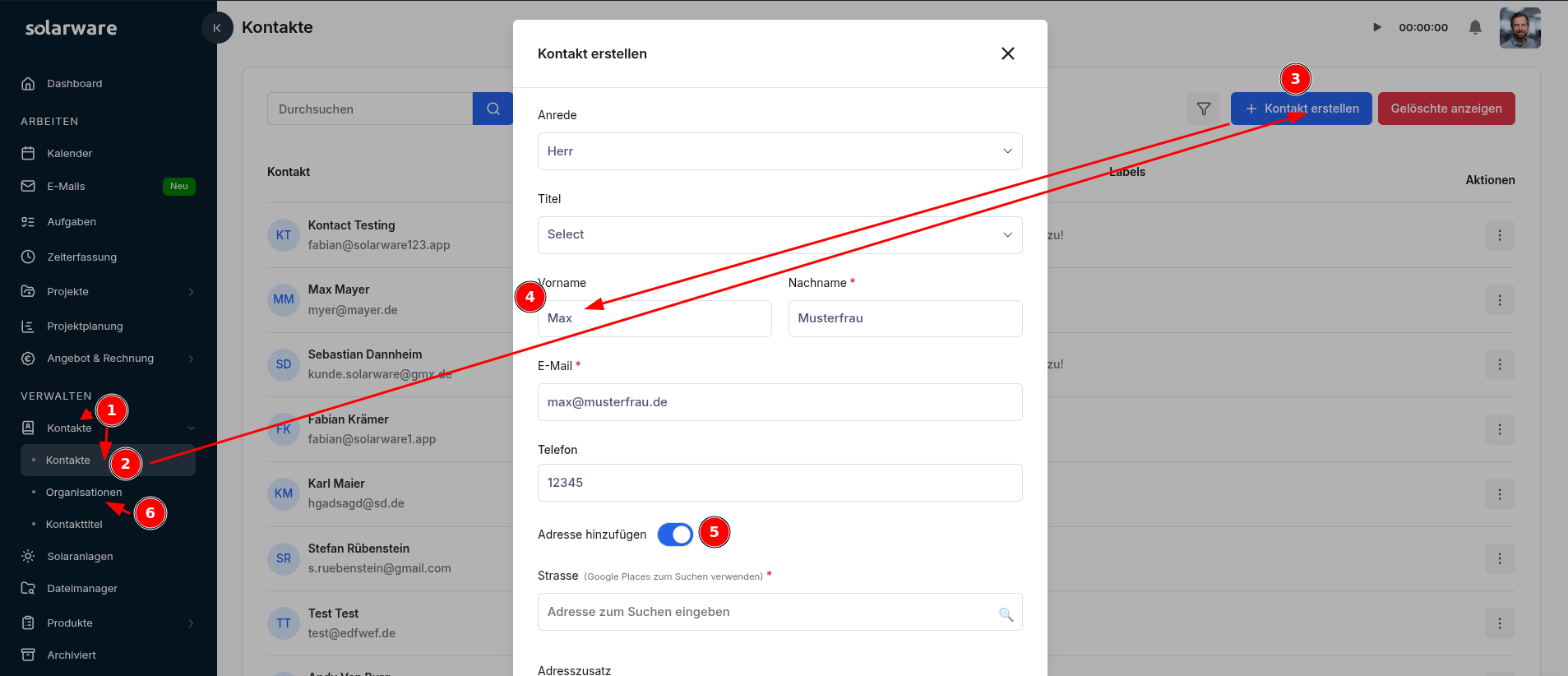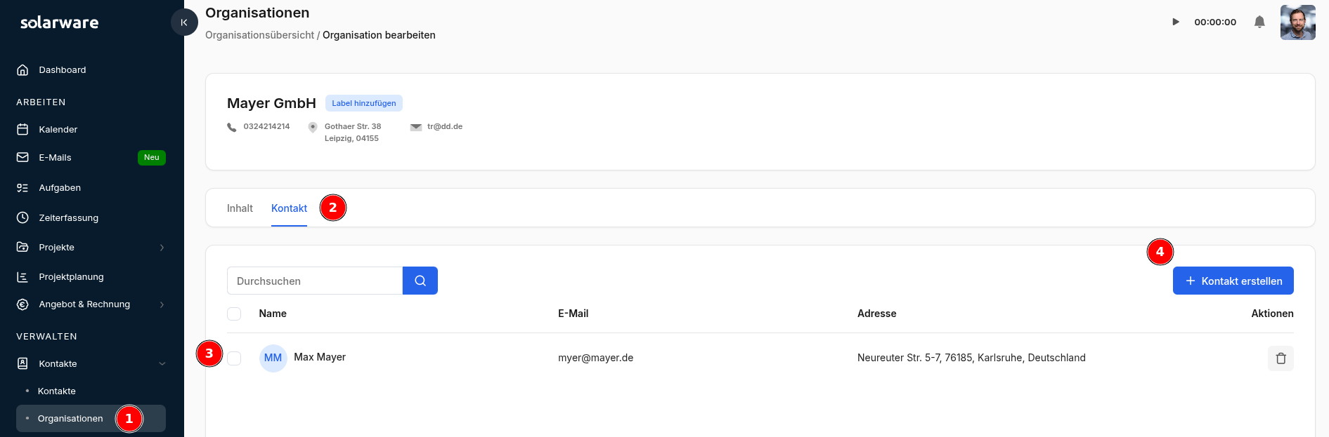 Wenn Du auf eine Organisation (1) klickst, kannst Du auch (2) Kontakte/Ansprechpartner zuweisen bzw. neu erstellen (4).